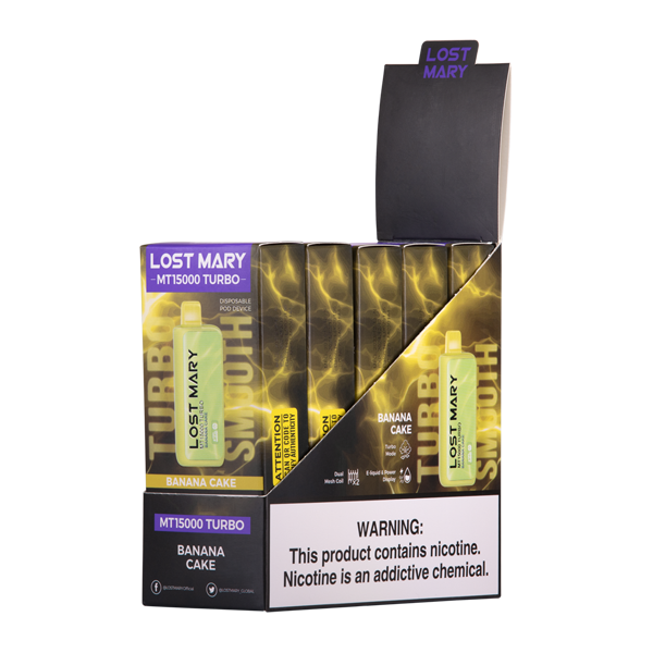 - Flavor: The comforting essence of ripe banana cake abounds in the dessert inspired Banana Cake Lost Mary MT15000 Turbo. Compelling and rich flavors for those tired of fruit and menthol fusions.